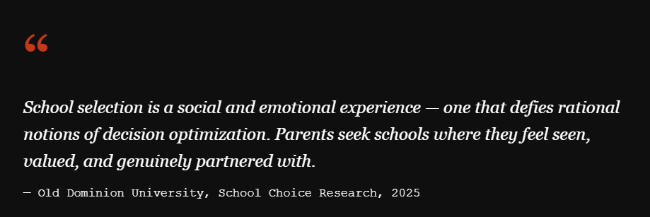 The research is consistent: trust in educational authorities is among the top predictors of school choice decisions — outranking academic metrics alone in multiple studies. [Taylor & Francis, 2025] For enrollment directors, this means trust isn’t a soft concept. It’s a quantifiable enrollment growth variable — and it can be tracked, managed, and improved.